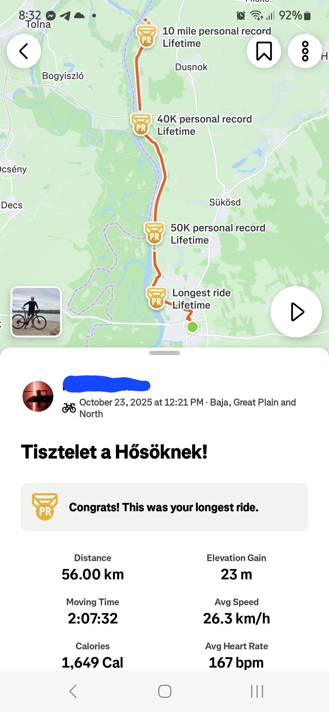 Gondoltam tekerek egy nagyot 23.-án. Sikerült egyéni rekordot dönteni,aminek nagyon örülök, főleg hogy a táv felét szembeszélben kellett végignyomni. A siker mindenért kárpótolt, de van még hova fejlődni. :D
