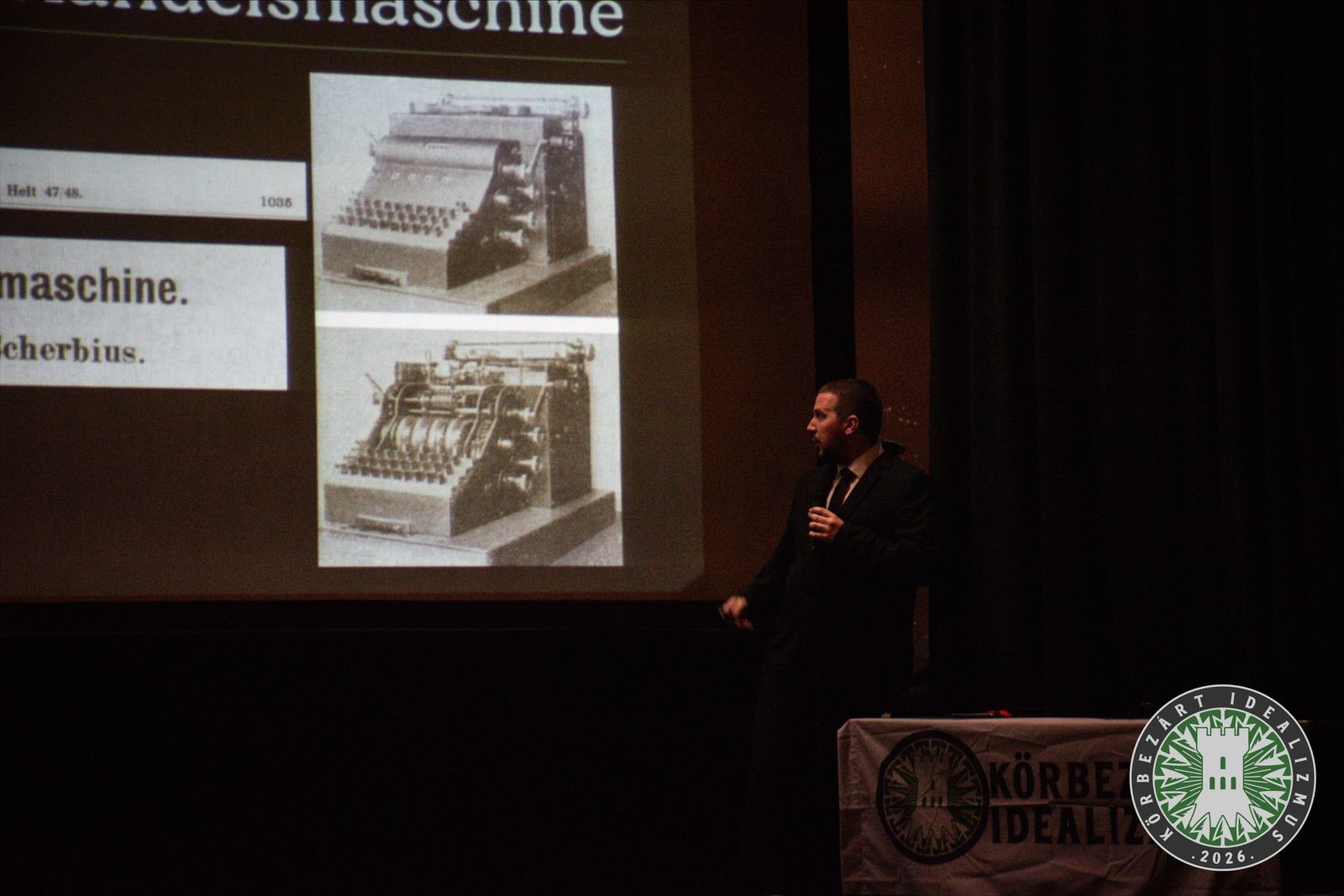 Ígéretéhez híven azonban – bár a bemutatott képek között több matematikai egyenlet is megbújt – mégis élvezhető, könnyen befogadható előadást hallhatott a zsúfolásig megtelt teremben a közönség. Az előadó röviden, de érthetően vezette be hallgatóságát a kódolás és kódfejtés alapvetői tudnivalóiba. Ezután az így felvértezett nézőközönséget egyszerre precíz és humoros előadásmóddal vezette végig az eredetileg bankok által használt kódgép valódi történetén.