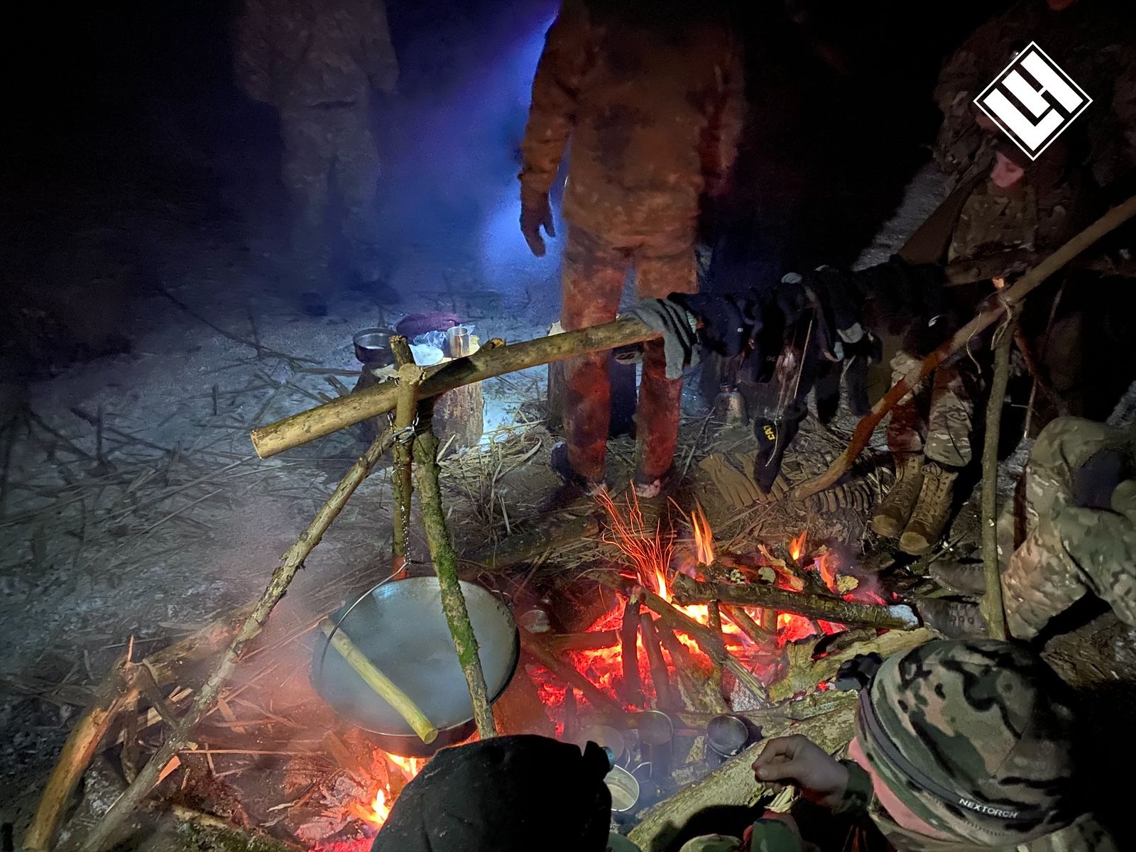 Nem sokára ránk is sötétedett, majd kaptuk is a következő feladatot. A vacsoránkat kellett előkészíteni, ami már a megszokott módon ezúttal is egy élő állat feldolgozása volt. Egy némakacsa került “terítékre”. A csapat egyik női tagja vállalkozott a feldolgozásban való részvételre, majd a főzést egy fiatal bajtársunk vállalta. Pár órával később mindenki jóízűen fogyasztotta a bográcsban főtt tarhonyás kacsát.