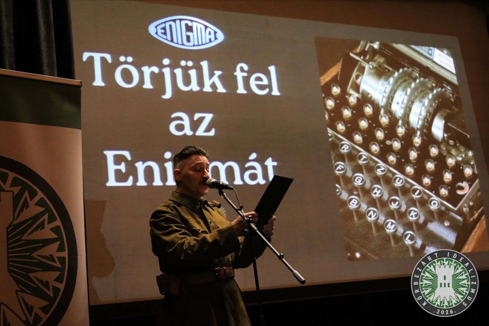 Ígéretéhez híven azonban – bár a bemutatott képek között több matematikai egyenlet is megbújt – mégis élvezhető, könnyen befogadható előadást hallhatott a zsúfolásig megtelt teremben a közönség. Az előadó röviden, de érthetően vezette be hallgatóságát a kódolás és kódfejtés alapvetői tudnivalóiba. Ezután az így felvértezett nézőközönséget egyszerre precíz és humoros előadásmóddal vezette végig az eredetileg bankok által használt kódgép valódi történetén.